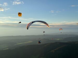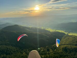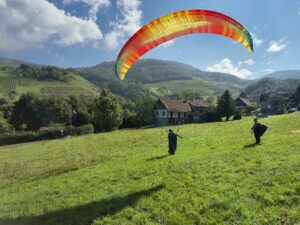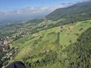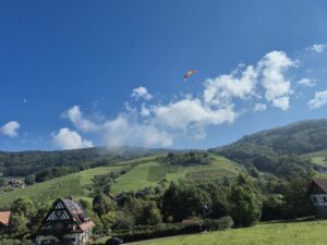 Auch bei der X Trophy waren einige Elztalflieger vertreten. Zu Gast bei den Borkies in Sasbachwalden stellten sich tapfere Hiker der Herausforderung den Schlossberg zu besteigen. Vorbei an malerischen Bächen und Weinbergen ging es bergauf. Trotz des auf Ost drehenden Windrades und großflächigen Bewölkung im Rheintal war es fliegbar: Sasbachwalden war die perfekte Flugoase an diesem Tag.